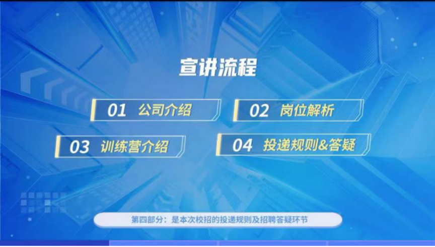 宣讲人进行了公司平台资源的介绍、岗位划分的详细介绍;此外概括了新人的培养方式,包括新人训练营和导师带领,并讲述了培养模式的特别之处。宣讲人还介绍了岗位的工作职责,并对各位同学的优势进行分析推荐适合岗位,技术类、策划类、美术类均有涉及。同学们对自己疑惑的地方提出问题后,由宣讲人或采用HR答疑方式针对同学们的问题进行解答。